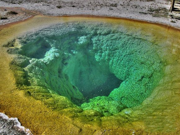 美國著名的黃石公園有數以千計的溫泉,這些溫泉碧藍澄澈,水霧蒸騰;上百個間歇泉噴射著沸騰的水柱。Morning Glory Pool溫泉在其中是最令人心馳神往的。Morning Glory Pool是熱泉,它的溫度一般是要比間歇泉低得多,所以其中能夠繁衍出豐富的藻類。Morning Glory Pool溫泉水溫在85℃時,泉內藻類為白色;82℃時呈現肉紅色;74℃時淺黃色;68℃時就變成了黃綠色。神奇之處就在于溫泉可隨著溫度的變化,顏色作隨相應的改變。