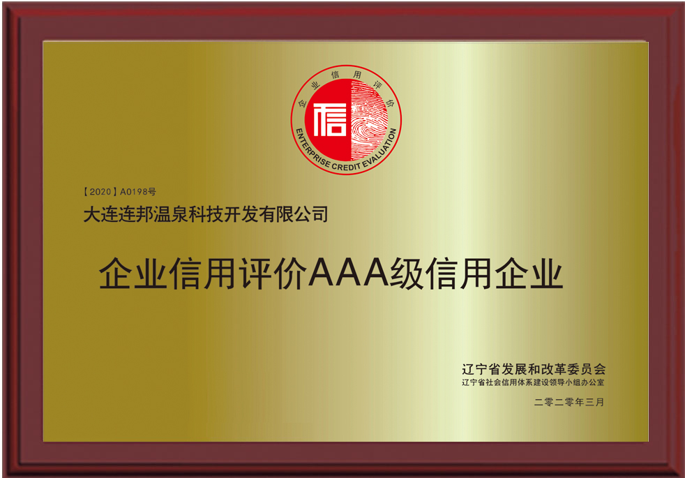 2020年3月,連邦溫泉科技通過遼寧省發改委信用等級評審,榮獲AAA級企業信用等級證書。AAA級企業在信用等級評定中是最高等級,這標志著連邦在企業信用建設上再上一階梯,進一步的增強了市場競爭力。
